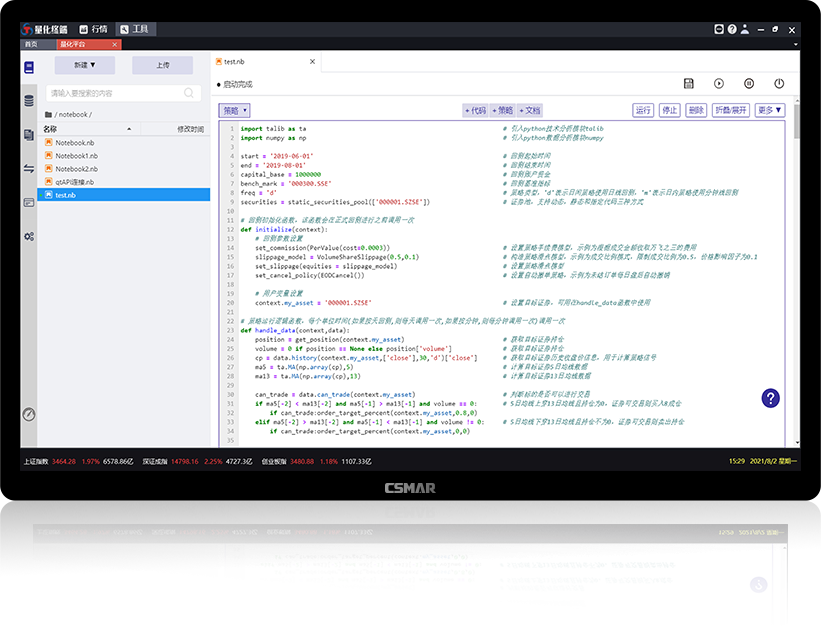 平台内置了完备的策略回测框架,让您的证券投资分析如虎添翼,更支持海量Python第三方模块,让您轻松搞定数据分析。
